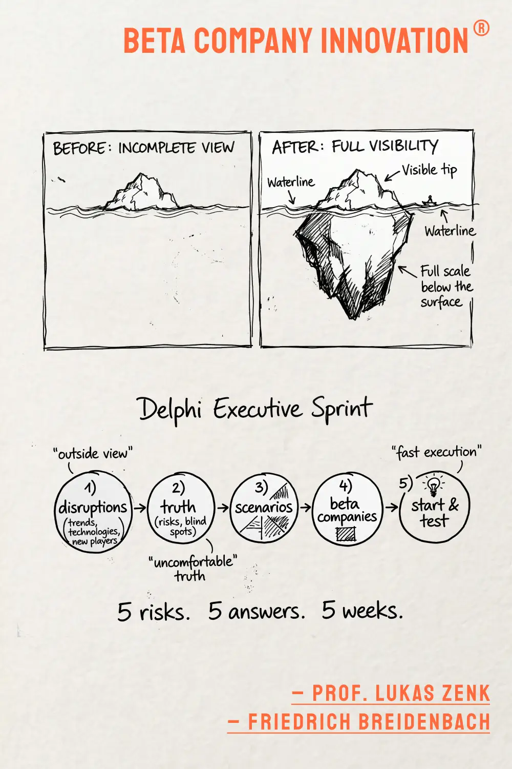 Die meisten Strategieprozesse leiden unter: Hierarchie → politischer Anpassung → Groupthink. Wir arbeiten mit einem Delphi-Setup. Ein etabliertes Forecasting-Verfahren aus der Zukunftsforschung. Seine Stärke: unabhängige Experten → keine Gruppendynamik → keine Hierarchien → ehrliche Einschätzungen. So entstehen ungeschönte Disruptionsszenarien. Ein echter Spiegel für das Management.